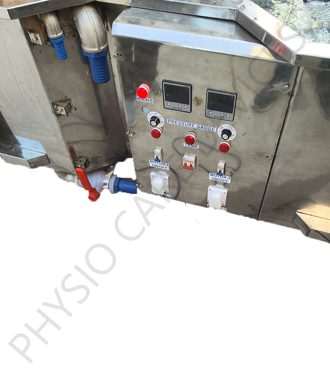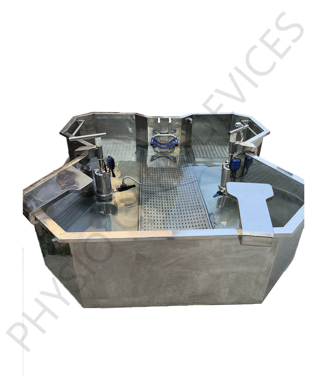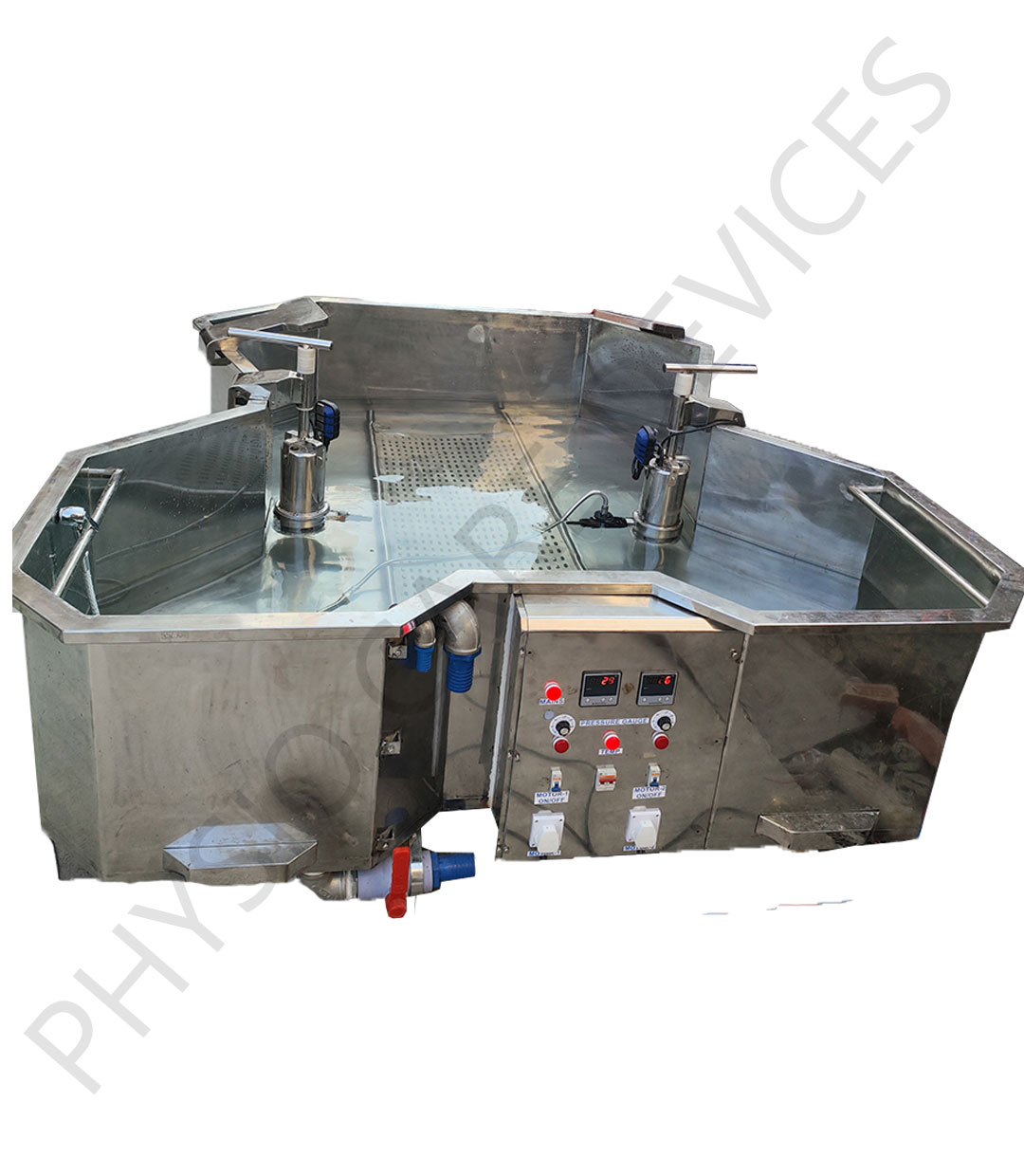 Accessories: One digital thermometer, 2 water inlets, drain and overflow pipes with all necessary fitting. – Adjustable Stainless Steel Head-Rest, – Stainless Steel Body Stretcher and Sitting seat fitted with nylon cloth.